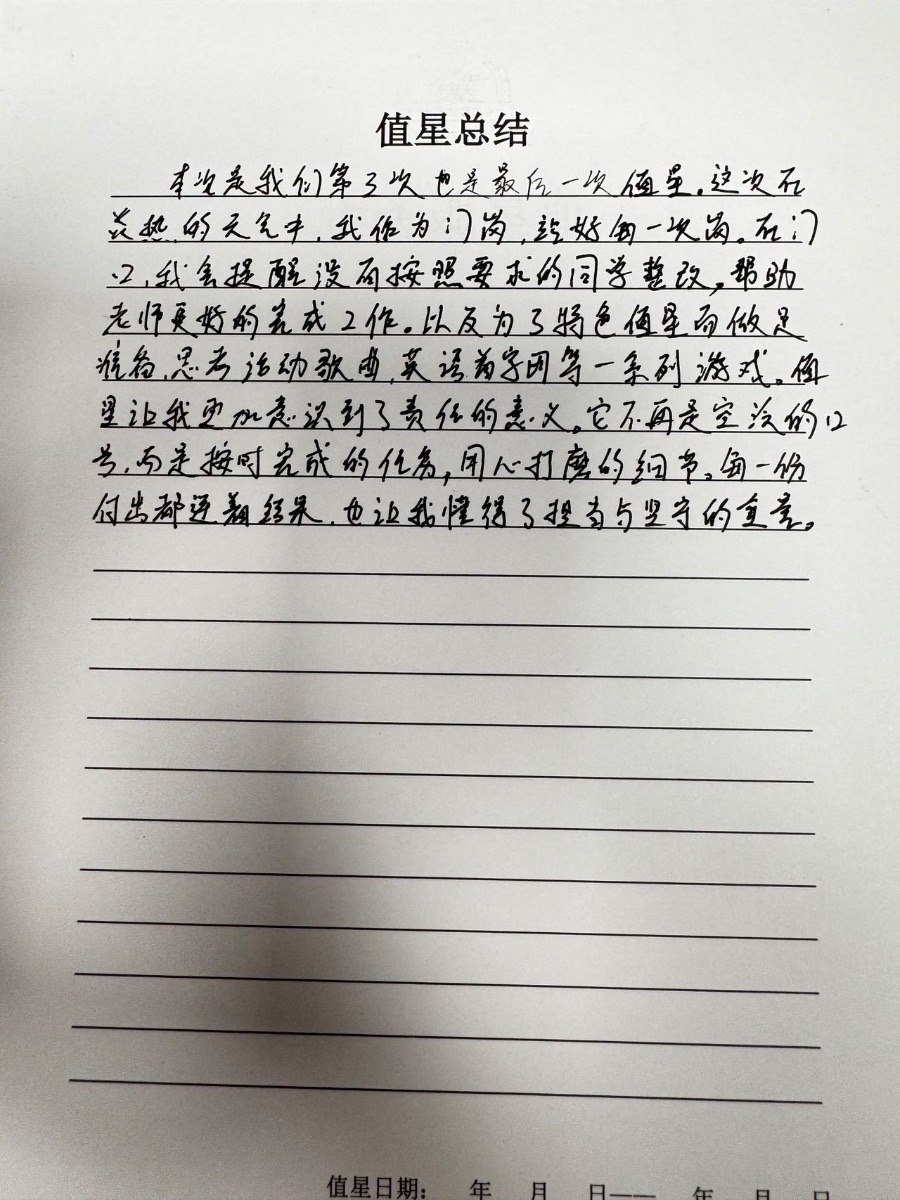 在门口,我会提醒没而按照要求着装的同学作出整改,帮助老师更好的完成工作。以及为了特色值星做足准备,思考活动歌曲曲目,英语首字母填空等一系列游戏。值星让我更意识到了责任的意义。它不再是空泛的口号,而是按时完成的任着,用心打磨的细节。每一份付出