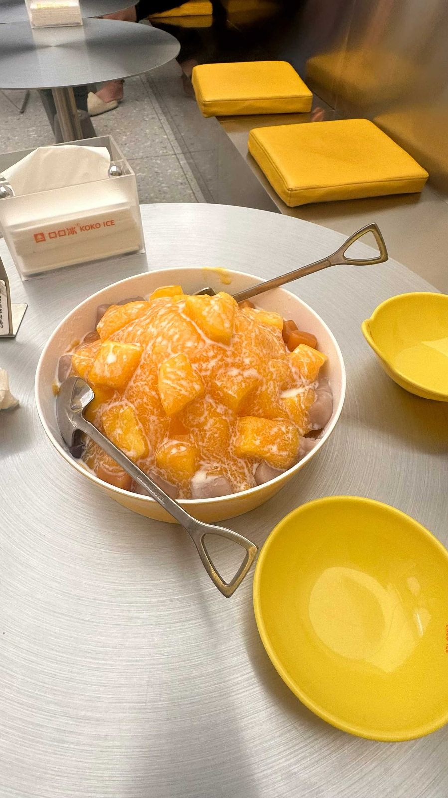周围的黄色餐具与座椅相互呼应,为空间注入明快活力,金属圆桌则添了几分现代感。纸巾盒上“口口冰 KOKO ICE”的标识清晰可见,暗示着这家店对冰品的专注与用心。