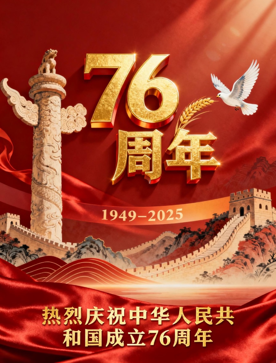 国庆节,五星红旗迎风飘扬,神州大地欢庆祖国七十六周年华诞。从积贫积弱到繁荣昌盛,高铁、大桥、航天成就举世瞩目。无论乡村田野还是城市灯火,人民以汗水与智慧铸就辉煌。我们铭记历史,感恩当下,坚定迈向未来。