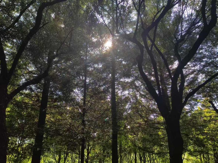 阳光穿透树叶的缝隙,在地面上投射出斑驳的光影,明明灭灭,像是大地在呼吸。深绿、浅绿、黄绿,各种层次的绿意在这里肆意铺展,将整个树林晕染成一块巨大的翡翠。空气里弥漫着青草与树木的清新气息,深吸一口,仿佛能将所有的疲惫都涤荡干净。