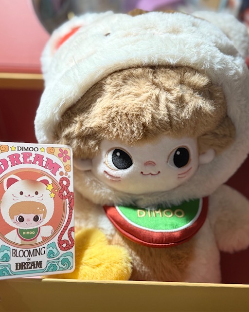 它身着一袭设计精巧的装扮:白色的毛绒连帽外套柔软蓬松,仿佛能给人满满的温暖;胸前的围兜以红绿撞色呈现,“DIMOO”字样醒目又别致。旁边的卡片上,“DREAM”“BLOOMING IN DREAM”的字样搭配萌趣的插画,与娃娃的风格相得益彰,尽显梦幻氛围。