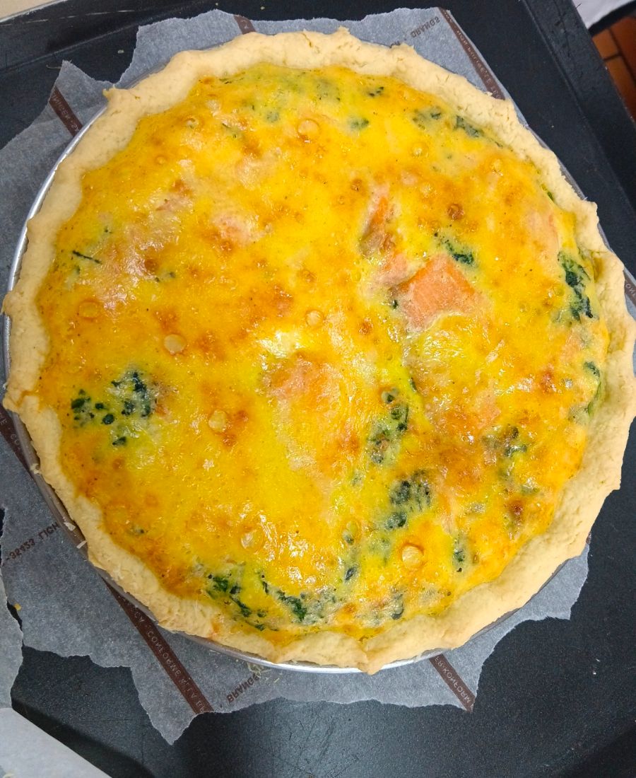 它的基底多是酥脆的黄油挞皮,无论是现成的酥皮还是手工制作,烤后都自带黄油香气,咬开时“咔嚓”作响;内馅核心是嫩滑的蛋奶液,加入淡奶油或牛奶调和,奶香浓郁且质地轻盈,像云朵般包裹食材;关键配料则是烟熏三文鱼与菠菜——三文鱼的咸鲜带着淡淡烟熏感,不腥不腻,菠菜焯水后去除涩味,留下脆嫩口感,还为挞体增添了鲜亮的绿色