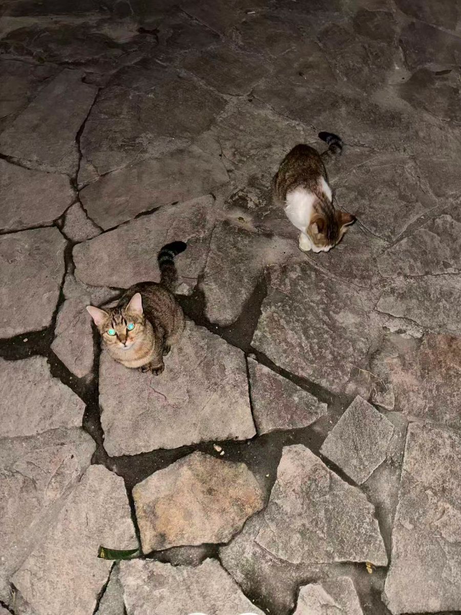 夜晚的石子路上,两只猫咪是这片小天地的“精灵”。左边的狸花猫有着一双在夜色里泛着幽蓝光泽的眼睛,像两颗神秘的宝石,它抬头望着镜头,眼神里带着几分好奇与警觉,仿佛在探究我这个不速之客的来意。右边的小花猫正低头专注地嗅着地面,尾巴轻轻摆动,像是在寻觅什么有趣的踪迹。粗糙的石子路在夜色下更显古朴,与猫咪们柔软的毛发形成了鲜明的对比。它们是小区里的“常住民”,每晚都会在这儿徘徊,或追逐嬉戏,或安静休憩,给夜晚的小区增添了一抹灵动的气息。偶然遇见它们,就像在平凡的夜晚里发现了一处温暖的小确幸,让人忍不住停下脚步,多看它们几眼,希望这份属于夜晚的温柔能在记忆里多停留一会儿。