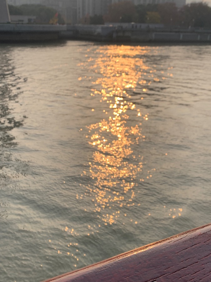 夕阳的金光洒在水面上,像一条流动的金色项链。河水微微波动,把阳光碎成无数闪亮的光斑,在水面上跳跃闪烁。画面右下角的木质栏杆,给人一种安稳的感觉,仿佛在邀请人们驻足欣赏这份宁静。远处的建筑和树木在暮色中变得朦胧,让整个场景更添了几分诗意。这是一个能让人忘记时间的瞬间,只留下光与水的温柔对话。