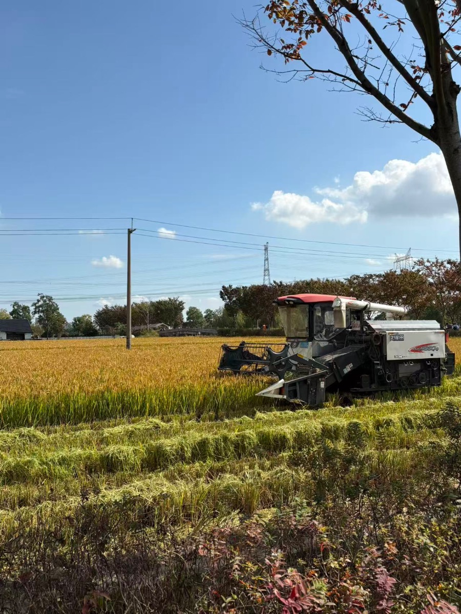 秋阳把稻田烤成金海,我站田埂看农人开车割稻。红收割机轰隆前行,拨禾轮旋转如巨掌,推倒稻浪,穗头欢跳,碎叶飞舞。马达声混泥土香,像土地在唱歌。农人握方向盘,回头冲我笑,皱纹被阳光镶亮。车过处,稻排成金色长辫,稻粒哗哗落仓,像雨落铁皮。我伸手,风从指缝穿过,带着新稻甜。眨眼,一片田只剩矮矮稻茬,静静守着天空。我按下快门,把轰鸣、稻香、笑容收进相片,像把秋天折成口袋,带回城市。夜里翻看,耳边仍响马达声,鼻尖仍嗅稻香。