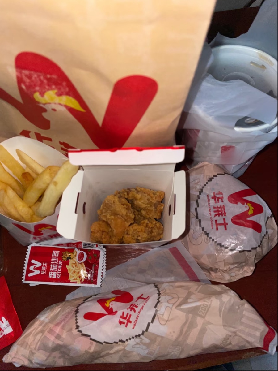 华莱士的餐食总是能带来接地气的美味满足。金黄的薯条炸得火候刚好,外皮酥脆,内里软糯,蘸上那包红艳艳的番茄沙司,酸甜与香脆在口中迸发,每一根都让人欲罢不能。炸鸡块裹着酥脆的外皮,撕开时还能看到鲜嫩多汁的鸡肉,咬一口,酥脆的外皮与嫩滑的肉质碰撞,香味在唇齿间久久萦绕。那两个包装精致的汉堡,拆开后能看到厚实的肉饼、新鲜的蔬菜层叠其中,面包胚松软有嚼劲,一口咬下去,麦香、肉香、蔬菜的清爽融合得恰到好处。旁边的饮品杯虽然已见空底,但不难想象它曾是解腻的绝佳搭档。这样一份套餐,实惠又管饱,是忙碌生活里便捷又美味的选择,难怪能成为众多快餐爱好者的心头好。