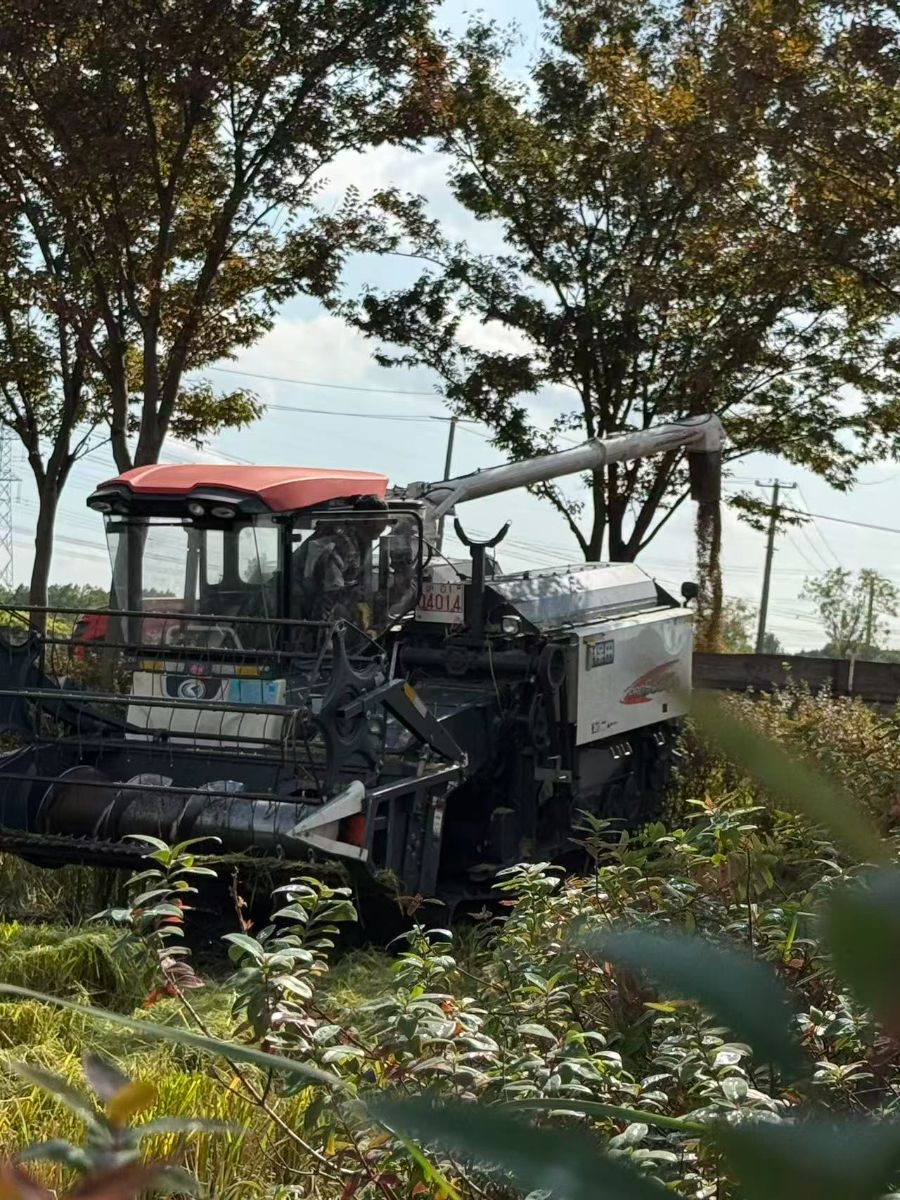 这张照片展现了一台大型农业机械在田间作业的场景。机械的主体为黑色,顶部有红色顶棚,显得十分醒目。它装备有复杂的管道和机械臂,似乎正在进行某种农作物的收割或处理工作。背景中可以看到一些树木和电线杆,显示出这是在开阔的田野中。前景模糊的绿色植物增添了照片的层次感,给人一种身临其境的感觉。阳光明媚,为整个场景增添了温暖的氛围,展现了秋收季节的繁忙与丰收的喜悦。