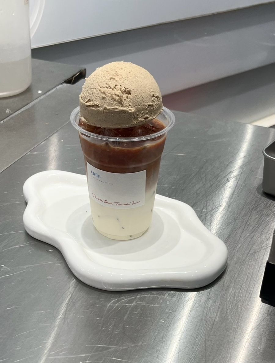 杯子上贴着一张简洁的白色标签,上面印有“Gelo”的字样,下方还有一行红色的手写体文字,增添了几分随性与艺术感。杯子被放置在一个形状独特的白色托盘上,托盘的边缘不规则,像是随意滴落的液体凝固而成,设计感十足。