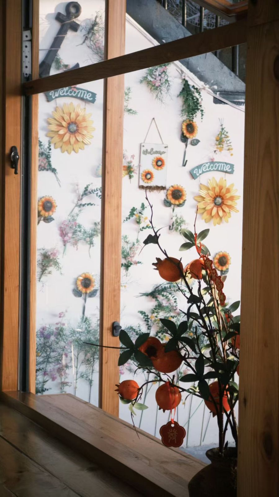 木质窗框把阳光切得温柔,磨砂玻璃上像炸开了一整个夏天——明晃晃的向日葵贴着玻璃舒展花瓣,黄得像揉碎的日光,连带着“welcome”的小牌牌都沾了暖融融的笑意。玻璃外的白墙更热闹,细藤缠着粉紫小花,锚形装饰藏在花影里,像偷藏的小秘密。窗沿那盆石榴最讨喜,橙红果子坠着“囍”字吊牌,连枝叶都带着雀跃的弧度,把中式的喜气和西式的温馨搅在了一处。光影从木框缝隙漏进来,给玻璃上的花镀了层绒边,连空气里都飘着松弛的甜。这扇窗像个会笑的小世界,把明媚和暖意都兜在里头,推开门好像就能撞进一怀抱的好天气。