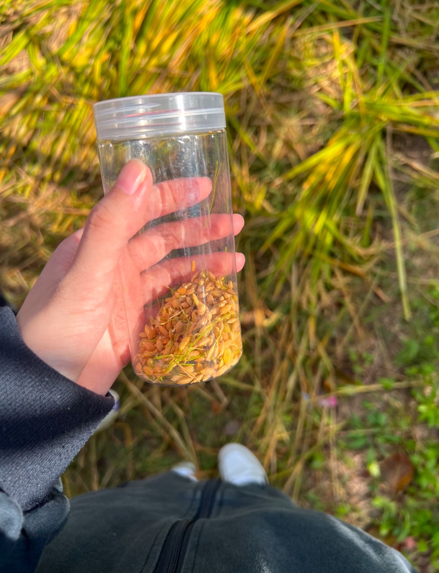 一只手握着透明小瓶,瓶里装着金黄的稻穗颗粒,带着细碎的稻芒,像是刚从田间撷取的丰收信物。背景是大片黄绿交织的稻田,阳光落在稻叶上泛着暖光,脚下露出的白鞋边,让画面多了几分生活的松弛感。这一幕像把秋天的田野“装”进了瓶里,细碎的谷物裹着风与阳光的气息,既藏着农耕的烟火气,也透着随手收集生活美好的温柔——把季节的片段揣在掌心,成了独属于此刻的小确幸。