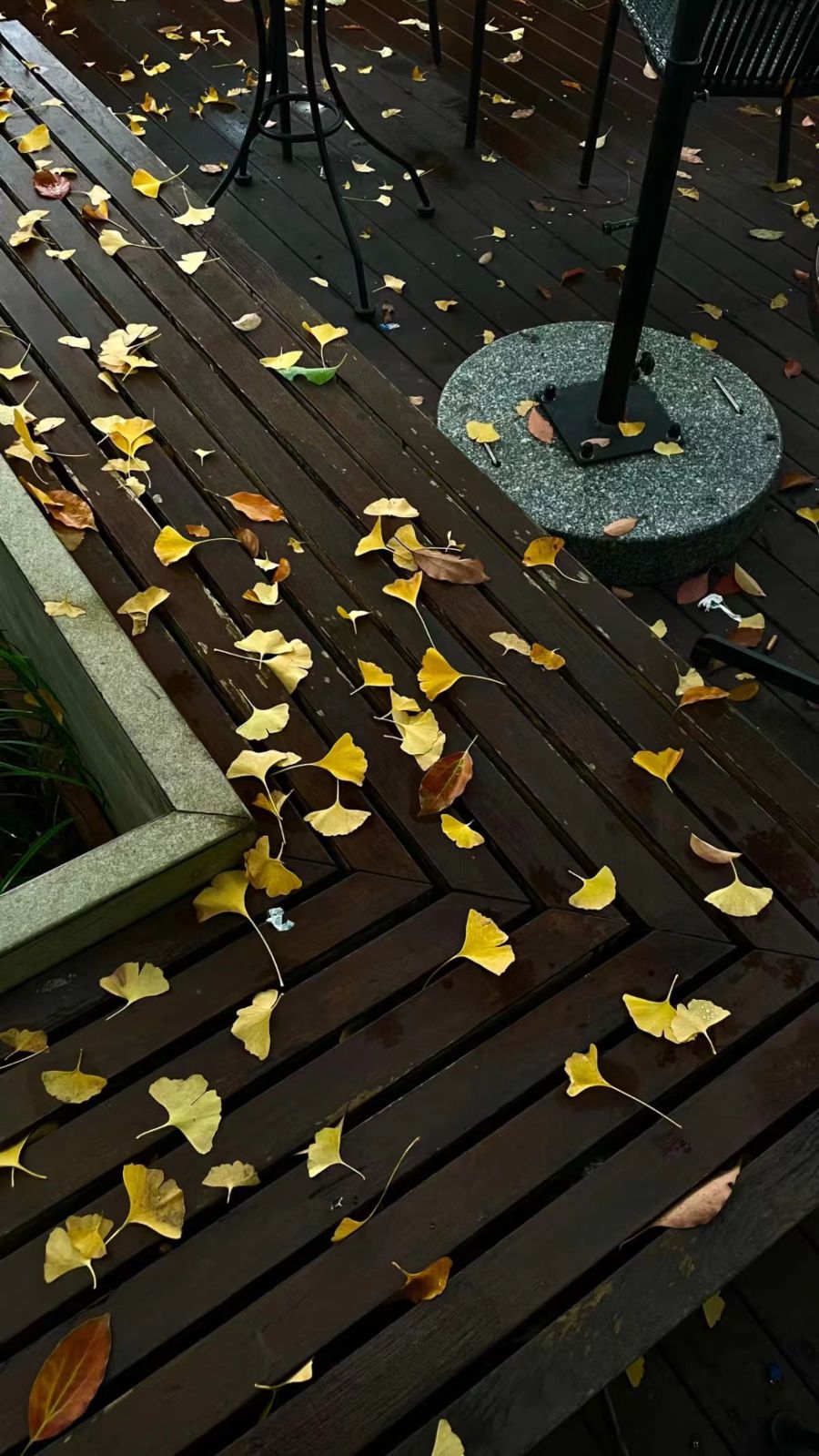 不必刻意捡拾,这些散落的金黄就是秋的信笺,落在露台的纹路里,落在桌椅的缝隙间,连带着湿意都成了温柔的注脚——是那种踩上去会轻响、看一眼就觉安稳的秋日闲景。