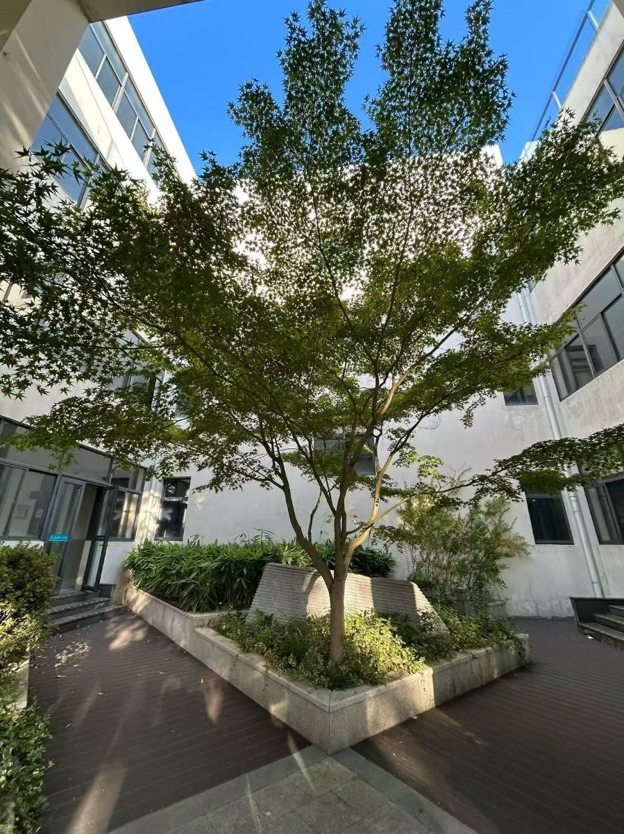 风掠过树叶的轻响混着建筑里若有若无的声响,阳光把树影投在花坛的石面上,连空气里都裹着草木和木质栈道的清冽气息,像在城市里偷来的一小段松弛时光。