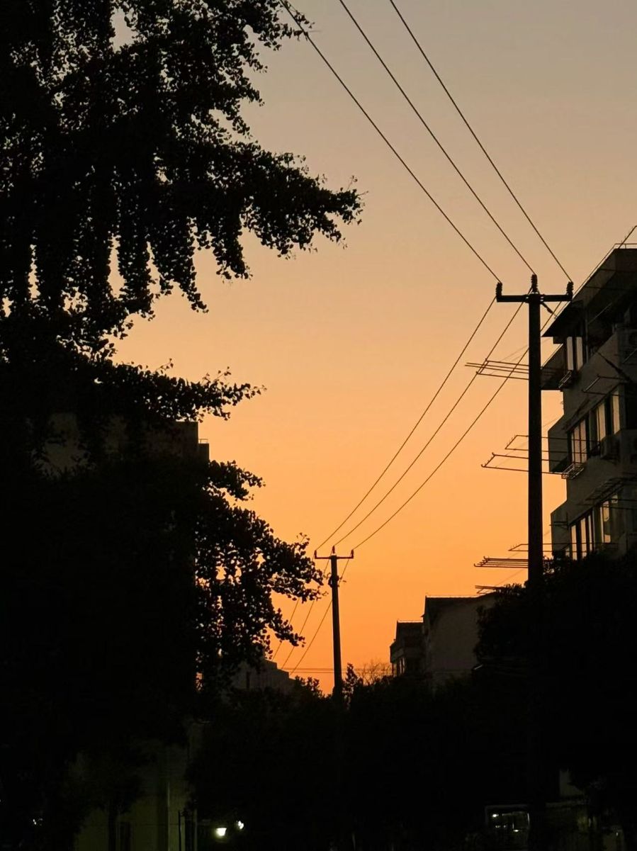 电线拉成细韧的弦,从电线杆上垂向远处,把橘色的天分成几缕温柔的块面。楼下的老房子藏在阴影里,只露出几扇亮着微光的窗,风里该混着晚饭的香气,还有树叶擦过电线的轻响,连空气都裹着傍晚特有的、慢悠悠的暖。