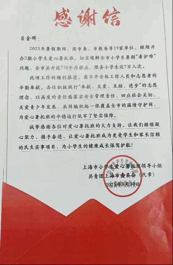 志愿服务期间,吕金辉同学始终践行“奉献、友爱、互助、进步”的志愿精神,以认真负责的态度、优质高效的服务,为爱心暑托班的平稳有序运行保驾护航,用实际行动诠释了新时代青年学子的责任担当,展现了我校学子昂扬向上的青春风采。