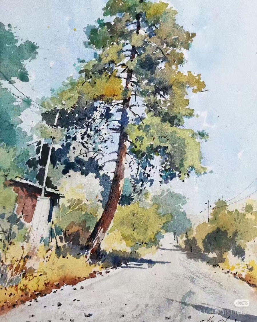 交画时,我看到别人的树挺拔而标准。我的那棵却微微歪着,枝叶纷披,仿佛正听着远方的风。它不像任何一幅范画,但纸上那团葱茏的绿影里,沙沙作响的,都是我记忆里的声音。