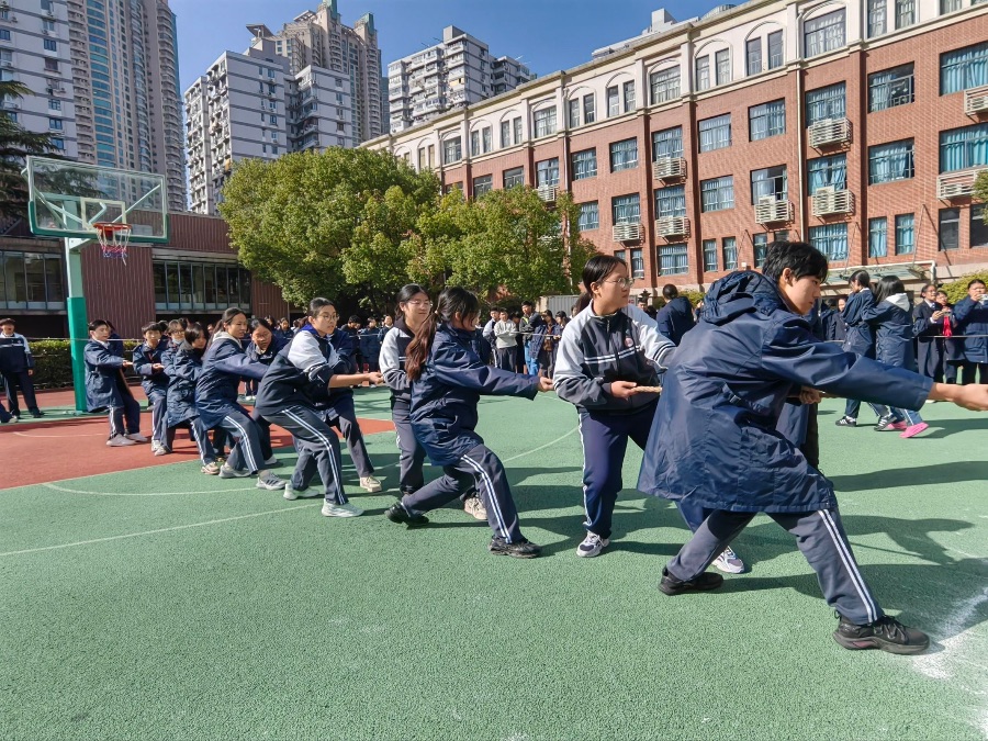 “嘟——”哨声划破长空,比赛开始了!两边的同学几乎同时往后仰,麻绳瞬间绷得笔直,像一条紧绷的弓弦。我咬紧牙关,双脚死死蹬着地面,鞋跟在塑胶跑道上蹭出沙沙的声响。手臂上传来一阵酸痛,可耳边全是震耳欲聋的加油声——班主任挥舞着班旗,扯着嗓子喊“加油”;啦啦队的同学们跳着脚,把嗓子都喊哑了;身边的队友们脸憋得通红,额头上青筋暴起,嘴里喊着整齐的号子:“一二!拉!一二!拉!”