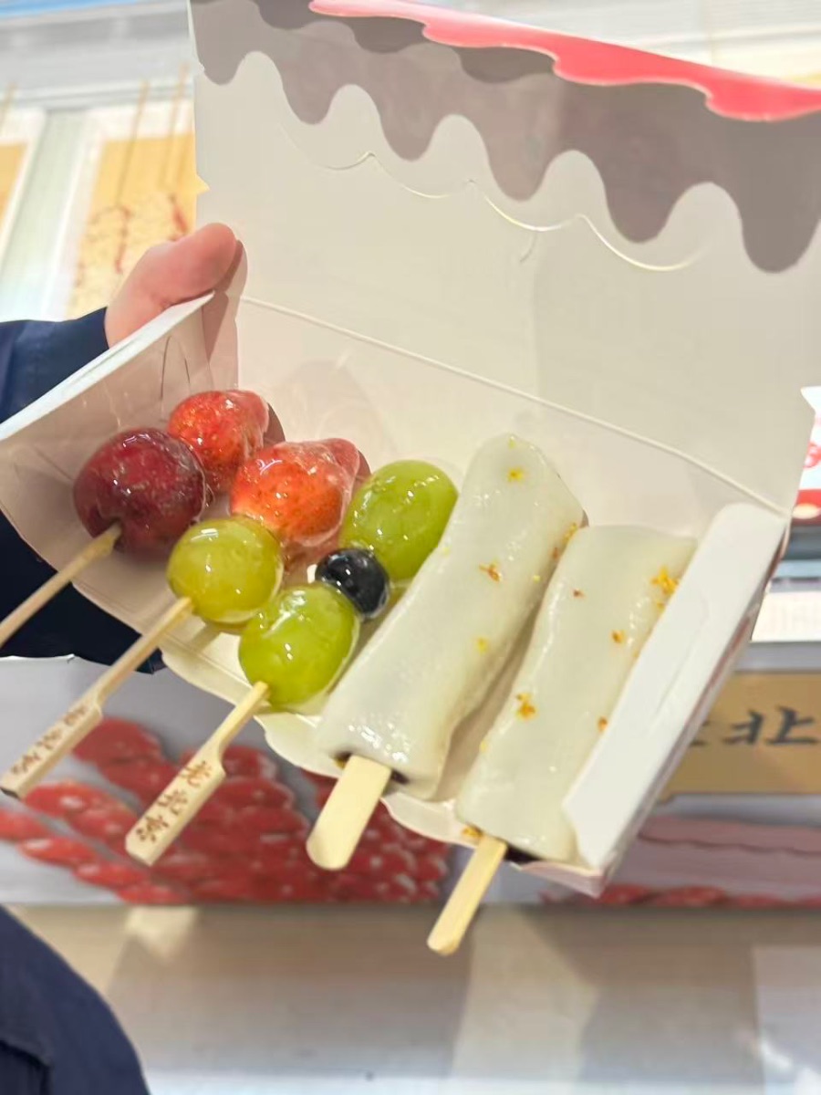 在老字号甜品店买到了盒装的糖葫芦和桂花年糕,颜值和口感都超在线。糖葫芦串着草莓、青提和山楂,糖衣薄而脆,咬开是新鲜的果肉;桂花年糕裹着淡淡的桂花香,软糯又清甜,放在精致的纸盒里,像一份精美的小礼物。拿着盒子走在店里,看着古色古香的装修,仿佛穿越回了老北京的街边。和朋友一人一串糖葫芦,一人一根年糕,边走边吃,聊着最近的学习和比赛,年糕的软糯混着糖葫芦的酸甜,滋味特别美好。原来传统小吃也能变得这么精致,既保留了老味道,又迎合了新审美,这也让我想到旅游管理里的文化传承,既要守住根,也要创新形式,才能让更多人喜欢。