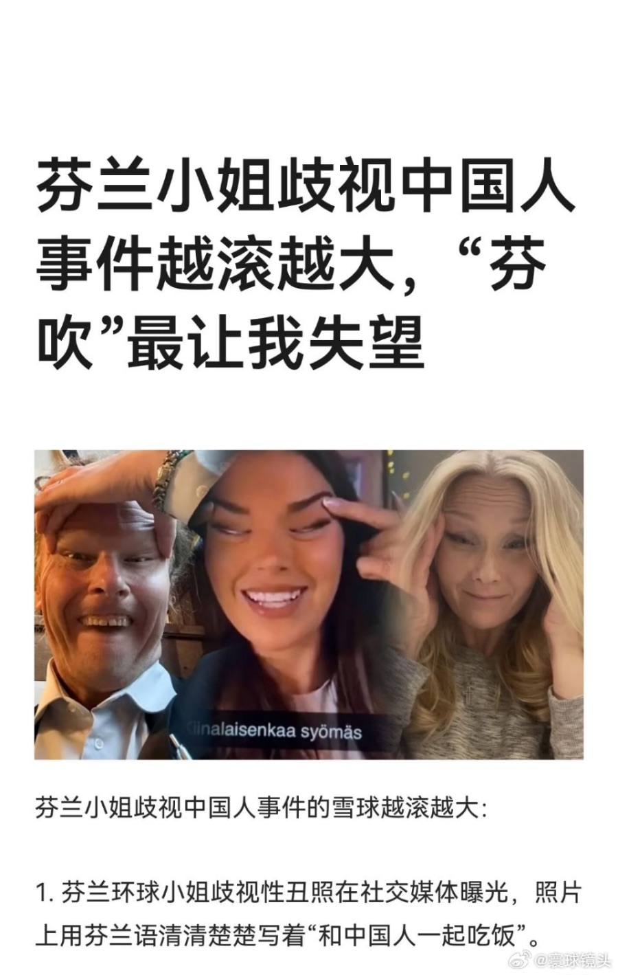 前“芬兰小姐”莎拉·扎夫斯因发布拉扯眼角的种族歧视手势并配文“去吃中餐”,在12月11日被主办方公开剥夺头衔并道歉,但事件引发的争议持续发酵,成为全球关注焦点。