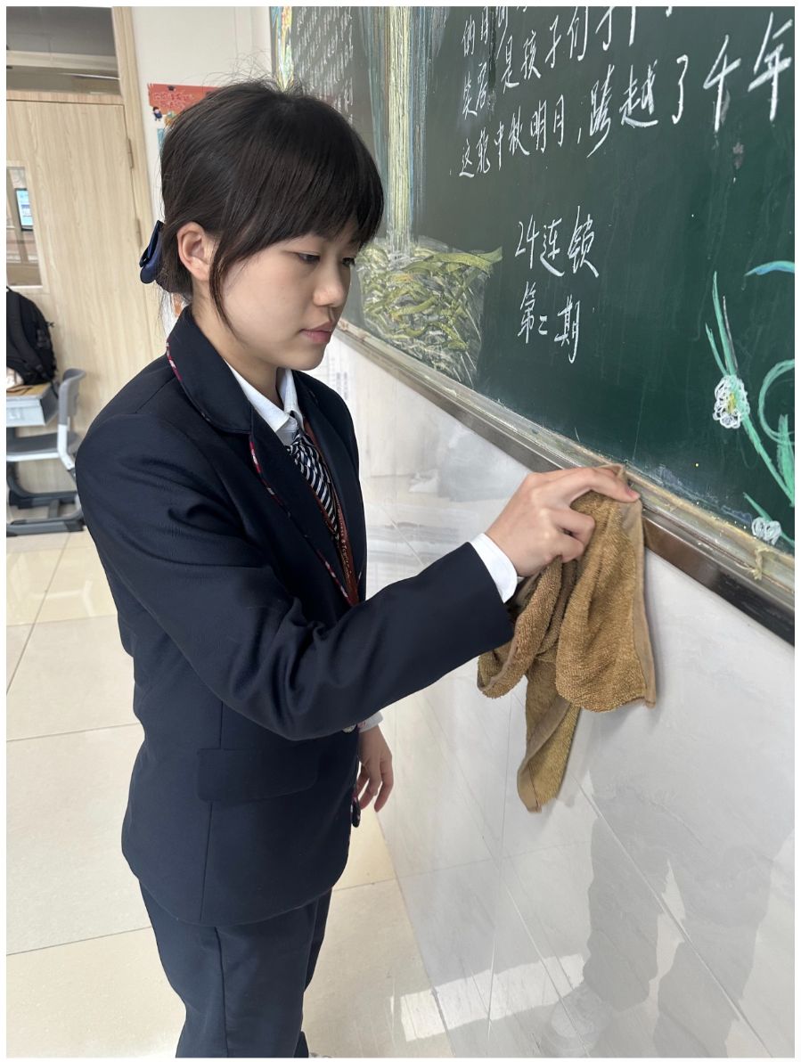 我们班实行一人一天的值日制度,轮到值日的同学从不含糊,不管是擦拭门窗、清扫地面,还是摆放桌椅、清理垃圾桶,都会仔仔细细完成每一项任务,确保教室始终保持干净整洁的环境。进校时,全班同学也都严格遵守校规:没有人佩戴耳机,校牌整齐悬挂在胸前,校服拉链规范拉好,用端正的仪容仪表展现班级的精神风貌。