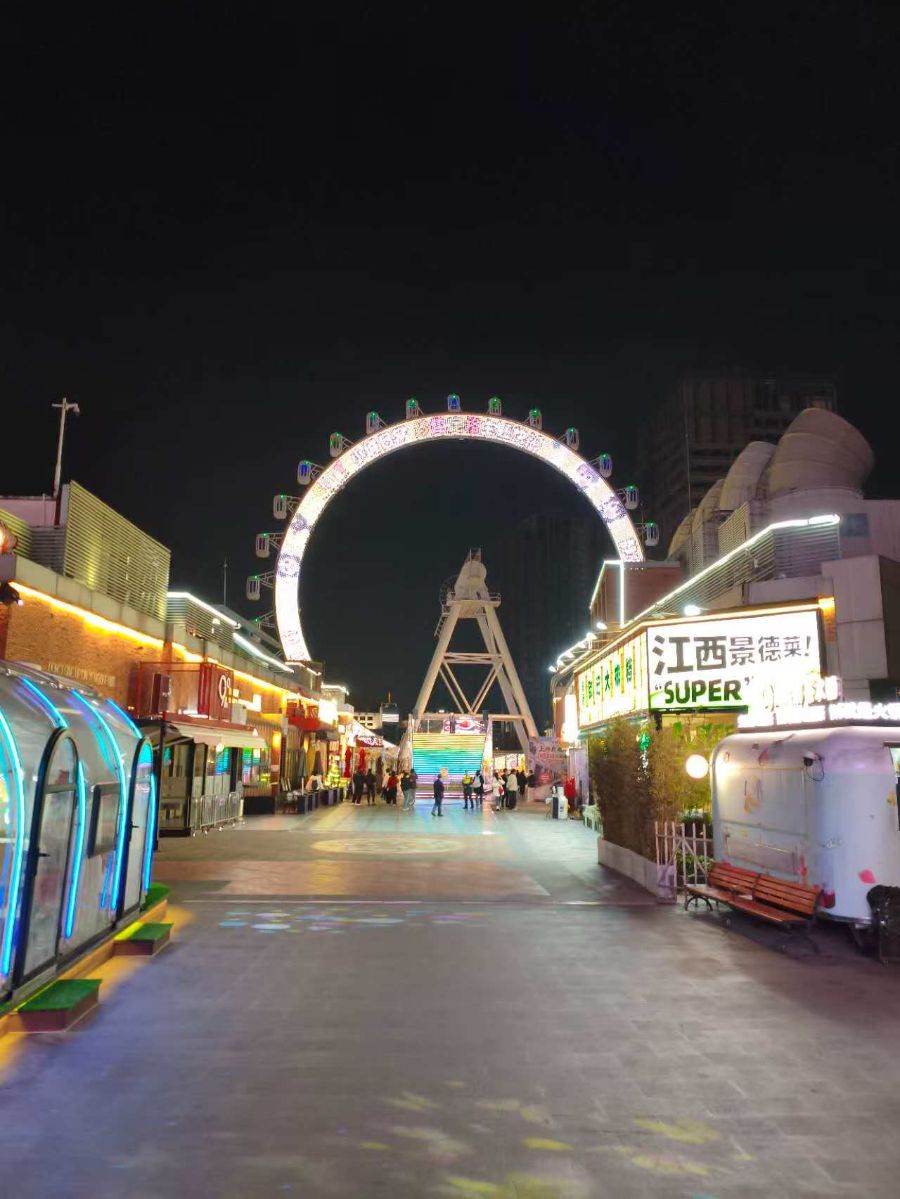 夜晚的静安大悦城热闹得很,步行街上灯火晃眼,两侧的商铺招牌亮着暖黄与霓虹的光,江西景德菜的招牌格外醒目,街边的餐车和座椅透着随性的烟火气。往前走,巨型的环形摩天轮就在视线尽头,银白色的轮身缠满彩灯,在黑夜里转出温柔的光晕,轿厢悬在轮边,像缀着的星星。路上人来人往,朋友笑着指着摩天轮说要去坐,晚风里混着美食的香气和人群的笑语,逛吃的快乐在这一刻拉满,魔都夜晚的鲜活与浪漫,都揉进了这方天地