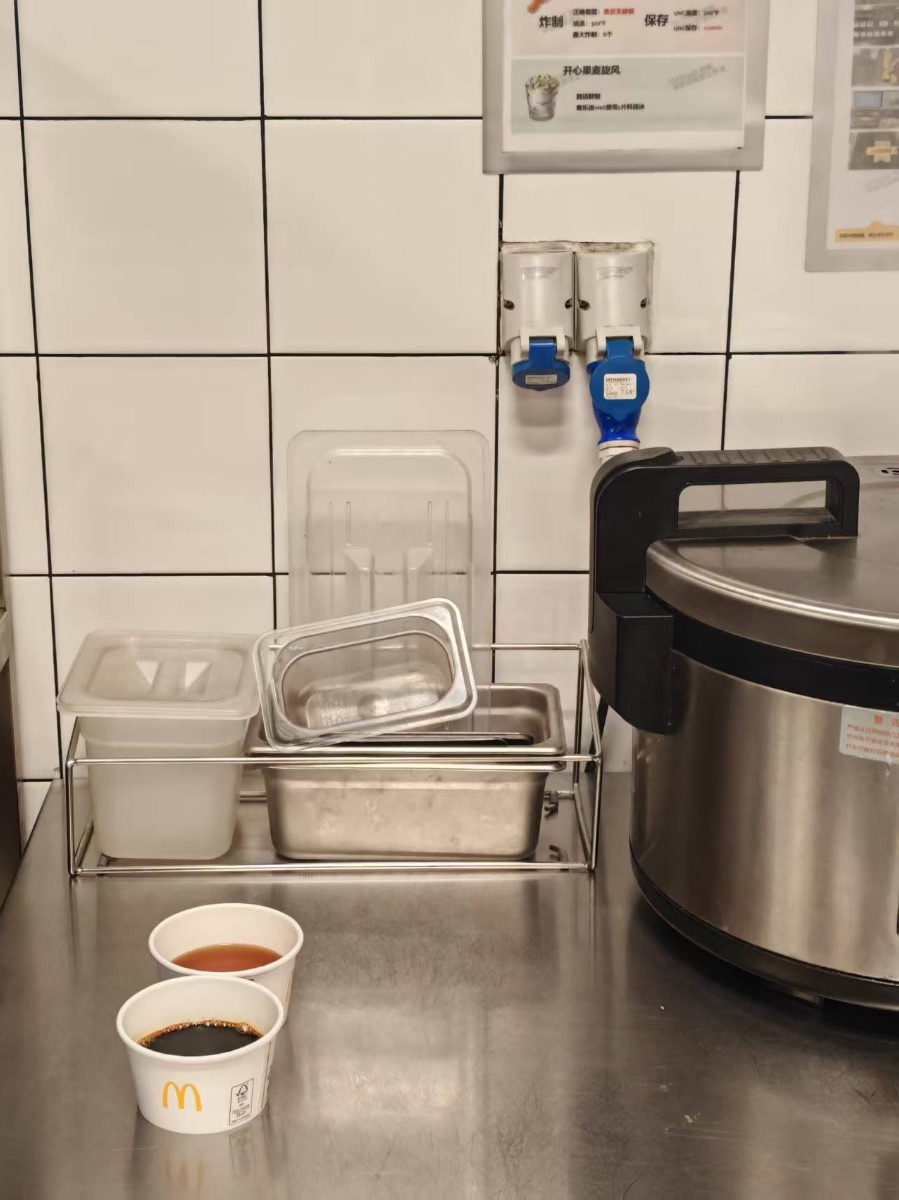 冬至这天,我守在麦当劳的后厨里,不锈钢台面冷硬的触感裹着油烟味扑面而来。台面上摆着两只印着金色M标的小纸杯,一杯盛着深褐的酱汁,一杯浮着浅红的汤汁,杯沿还凝着薄薄的水汽。旁边的金属置物架里,透明餐盒和不锈钢方盘叠着,在白瓷砖墙的映衬下泛着冷光,大型保温锅的黑把手硌着台面,水管口的蓝色阀门还滴着水。