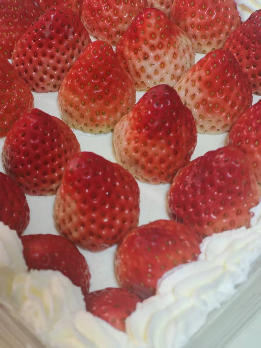凑得近近的看这块草莓蛋糕,颗颗草莓被切得饱满厚实,嫣红的果肉上布着细密的黄白色籽,像撒了把碎钻,果身还凝着晶亮的汁水,在光线下漾出诱人的光泽。草莓们挨挨挤挤地铺在蛋糕上,边缘的果肉微微翻卷,渗出来的红汁顺着奶油的纹路淌开,晕出淡淡的绯色。