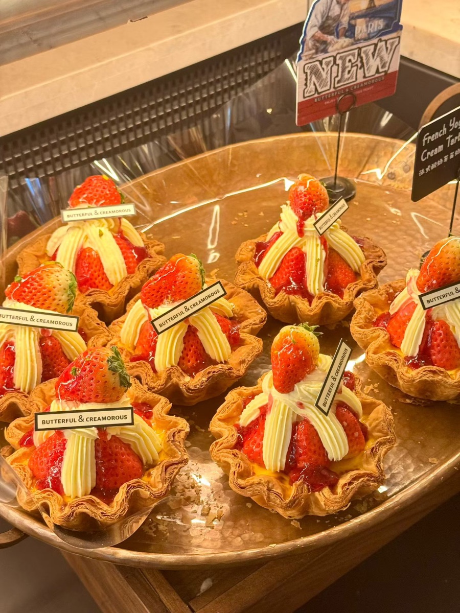 淡奶油被挤成柔滑的竖纹,从草莓顶端垂落,奶白与艳红碰撞出温柔的色彩,小小的黑色品牌标签斜插在挞上,添了几分精致的仪式感。后方的“NEW”标识牌透着新鲜的讯号,暗示着这份甜是刚上新的惊喜。