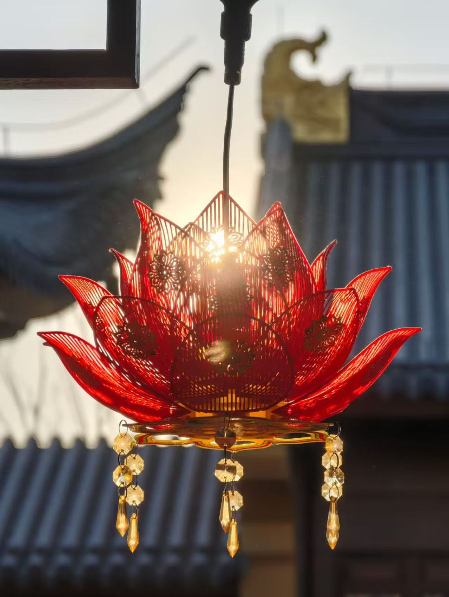 逛古寺时,一眼就被这盏红莲灯勾住了目光。艳红的莲瓣纹路细腻,层层叠叠地舒展着,像一朵盛放在半空的红莲。夕阳从灯芯处穿过来,把花瓣镀上了一层金芒,坠着的水晶流苏轻轻晃悠,闪着细碎的光,精致得让人挪不开眼。