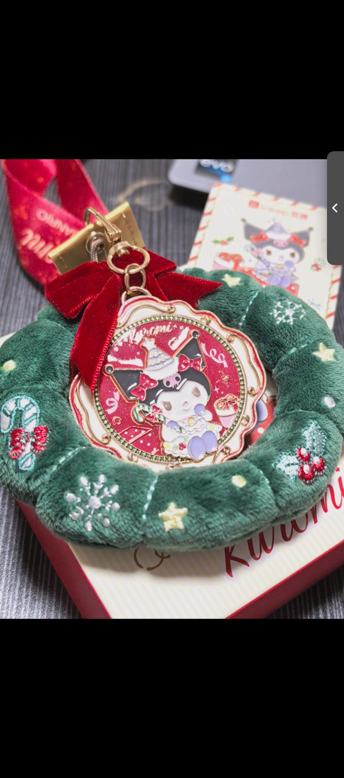 背景里的礼盒印着同款库洛米图案,浅黄的底色配着红纹,与花环的红绿相映成趣。这小小的物件,像是把圣诞的魔法封存在了方寸之间,摆在桌角,便仿佛能听见铃铛轻响,看见飘雪落在松枝上,满是温柔的节日甜意。