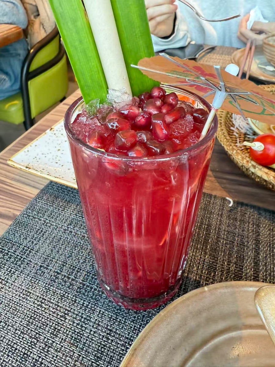 这杯石榴汁堪称视觉与味觉的双重盛宴。高身的竖纹玻璃杯里,满满一杯鲜红的石榴汁色泽浓郁透亮,像是揉碎了晚霞酿就的佳酿。杯口堆着饱满的石榴果粒,颗颗晶莹饱满,还覆着一层细碎的冰沙,凉意仿佛透过画面扑面而来。杯身插着几根青绿的香茅茎,白绿相间的茎秆笔直挺立,不仅增添了清新的泰式风情,还能让饮品融入淡淡的香茅香气。杯口还别着一枚纸质的小纸伞,俏皮的装饰让这杯饮品更具度假的松弛感,光是看着,仿佛就能尝到石榴的清甜与香茅的清新交织的美妙滋味。
