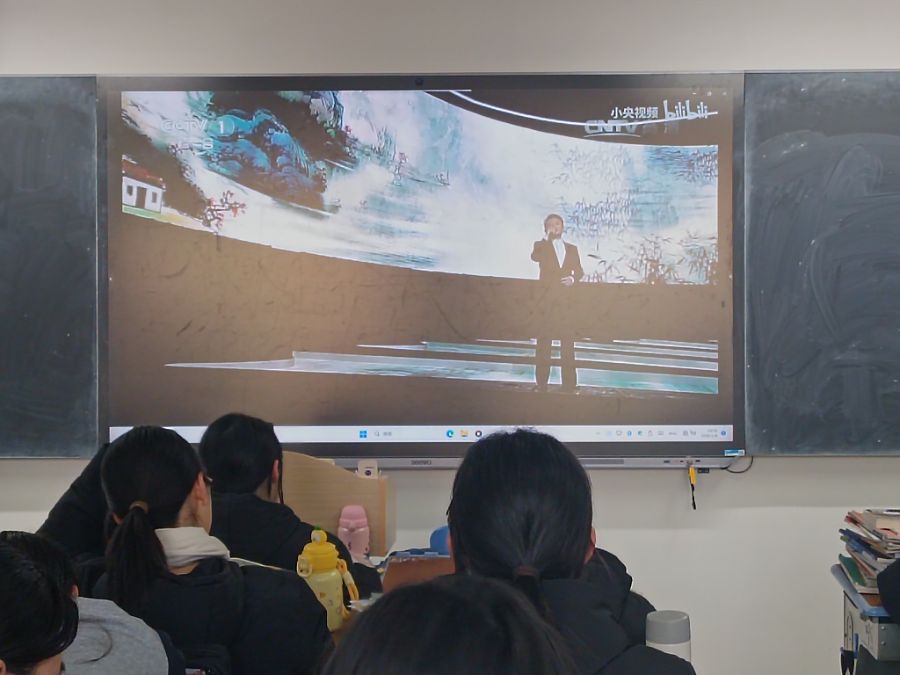 同学们在班会上通过视频体会古诗词比赛的精彩