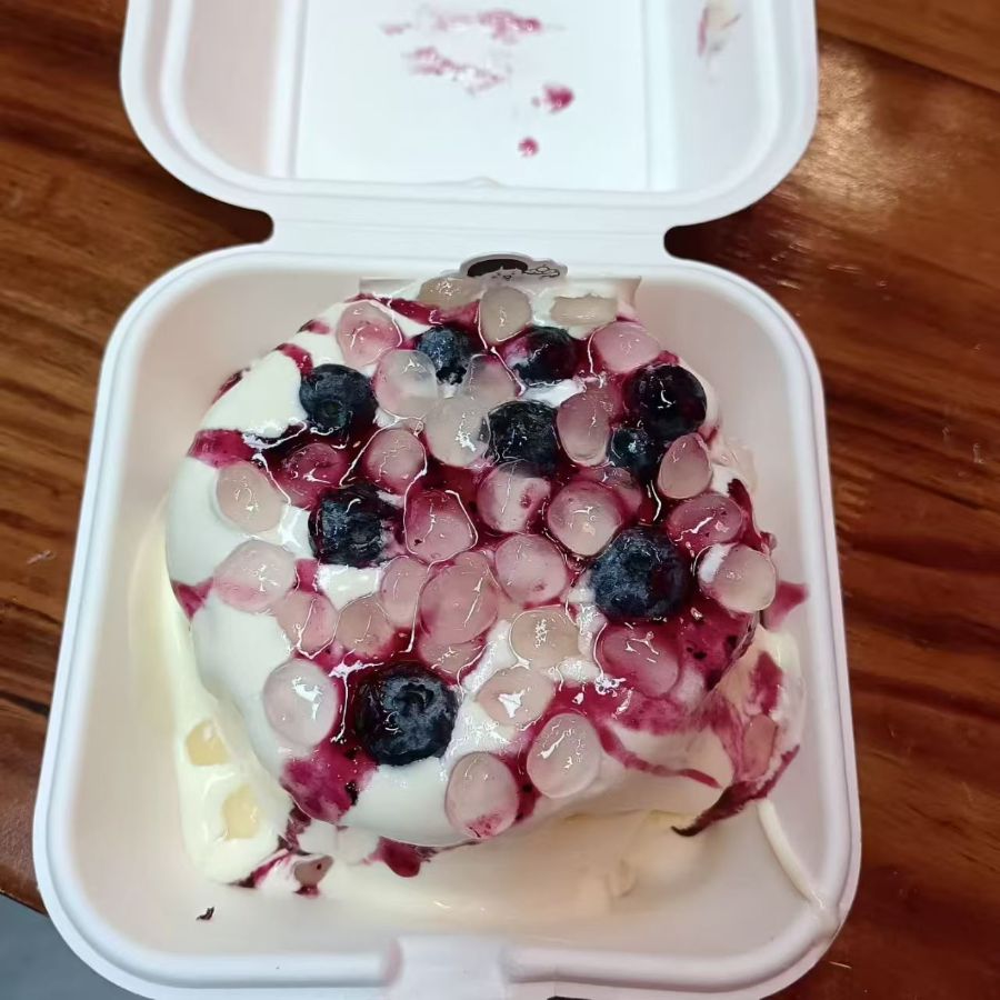 饱满的蓝莓颗颗圆润,果皮覆着薄薄的果粉,覆着薄薄的果粉,果肉仿佛浸满了清甜的汁水,与浓稠的蓝莓酱相融,顺着奶油的纹路缓缓流淌,在蛋糕表面晕开深浅不一的紫调。那些半透明的爆珠尤为讨喜,圆滚滚的模样透着粉嫩的光泽,轻轻一碰仿佛就要爆开,想来咬破的瞬间,清甜的果味会在舌尖迸发。