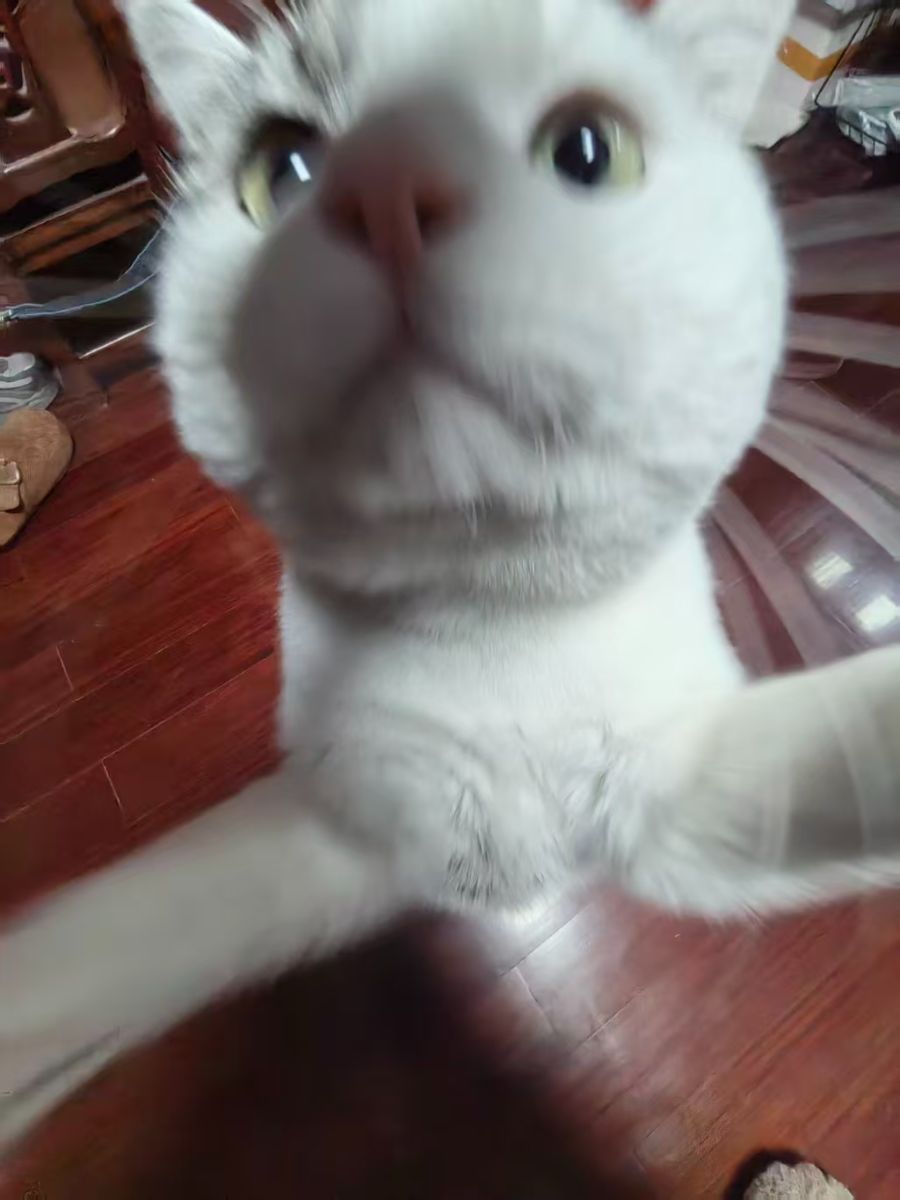 背景里红棕色的木质地板纹理温润,隐约可见的家具轮廓模糊又温馨,让猫咪的纯白身影愈发突出。整个画面因这只猫咪的近距离互动,满是亲昵又治愈的氛围,仿佛能感受到它柔软的毛发蹭过指尖的触感,连空气里都像是飘着甜甜的暖意。