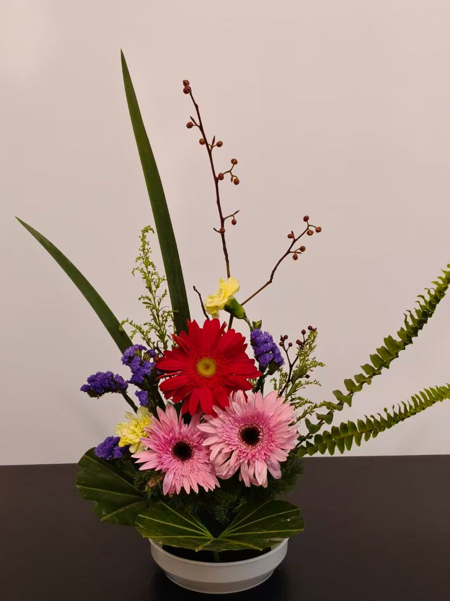 半学期的插花社团落下帷幕,本次社团的考核作品以红、粉扶郎花为视觉中心,搭配黄色康乃馨、紫色勿忘我作为点缀,再用巴西叶打底、剑叶与尤加利叶勾勒线条,最后加入枯枝提升整体层次。制作时,我先用巴西叶铺出稳定基底,再插入剑叶确立纵向骨架。一开始剑叶角度总把握不好,不是太呆板就是失衡。我反复调整角度,并加入枯枝柔化线条,才让整体造型变得灵动协调。插入扶郎花时,我发现它的花茎脆嫩易折,便特意斜切花茎并及时补水,才让花朵始终保持饱满状态。