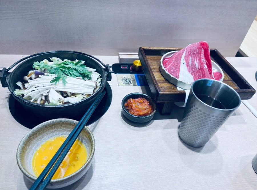 浅木色的餐桌上,正铺陈着一顿充满暖意的餐食,烟火气在光影里缓缓流淌。左侧是一口黑铸铁锅,锅内层层叠叠码满了新鲜食材:脆嫩的白菜、细长的金针菇、带着褶皱的香菇,还有几片紫洋葱点缀其间,最上层铺着一把翠绿的茼蒿,叶片舒展,仿佛还带着刚从田间摘下的鲜活气息。锅身的把手泛着冷冽的金属光泽,与锅内的温热形成温柔的对比。锅边摆着一只粗陶碗,盛着澄黄的蛋液,一双黑色筷子斜搭在碗沿,蛋液表面泛着细碎的油光,像是在等待着被冲入滚烫的汤中,化作绵密的蛋花。旁边的小瓷碟里,盛着红亮的辣白菜,酸甜的香气仿佛已经透过画面扑面而来,是解腻的绝佳搭配。右侧的木质托盘上,一片纹理清晰的和牛被精心码在粗陶盘里,红白相间的脂肪与瘦肉交织成漂亮的大理石花纹,在灯光下泛着诱人的光泽,仿佛下一秒就要被夹入锅中,在沸汤里烫出鲜嫩的滋味。一旁的锤纹金属杯里盛着清水,冰凉的质感中和了热食的温度。整套餐食在简洁的木桌上铺展开,没有繁复的装饰,却藏着最踏实的治愈感——一口暖锅,一片好肉,一碟小菜,便是冬日里最妥帖的慰藉,让人忍不住期待起汤汁沸腾、香气四溢的时刻。