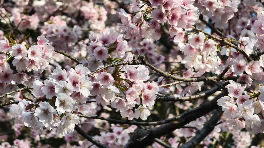 深褐色的枝干舒展着,缀满了层层叠叠的樱花花瓣。粉白相间的花色娇嫩又清新,阳光透过花瓣的缝隙洒下来,光影斑驳落在枝头,连空气里都仿佛飘着淡淡的甜香。风轻轻拂过,花瓣微微摇曳,偶尔有几片轻轻飘落,像一场温柔的粉色小雨,氛围感直接拉满
