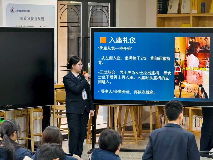 3月18日中午,一场精彩的特色值星活动在上海市商贸旅游学校浦东校区咖吧上演。此次活动由我们25酒店管理一班开展,旨在宣传中西餐餐桌礼仪,结合文化传承,展示酒店专业特色技能,并通过实际操作进行特色体验,提升大家的知识储备和动手能力。活动开始,就迎接了很多同学,讲解的同学向大家热情介绍了中餐和西餐的餐桌禁忌和礼仪。 活动现场很是欢乐,同学们都认真学习了中餐的入座礼仪和西餐的刀叉语言,这之后,同学们分为两波,分别体验了西餐早餐摆台和中餐的餐巾折花。这次特色值星活动的成功举办,不仅展示了25酒店管理一班学生的专业知识储备,也为其他学生提供了体验酒店专业文化知识的机会,进一步激发了大家对酒店管理专业的学习和热情。