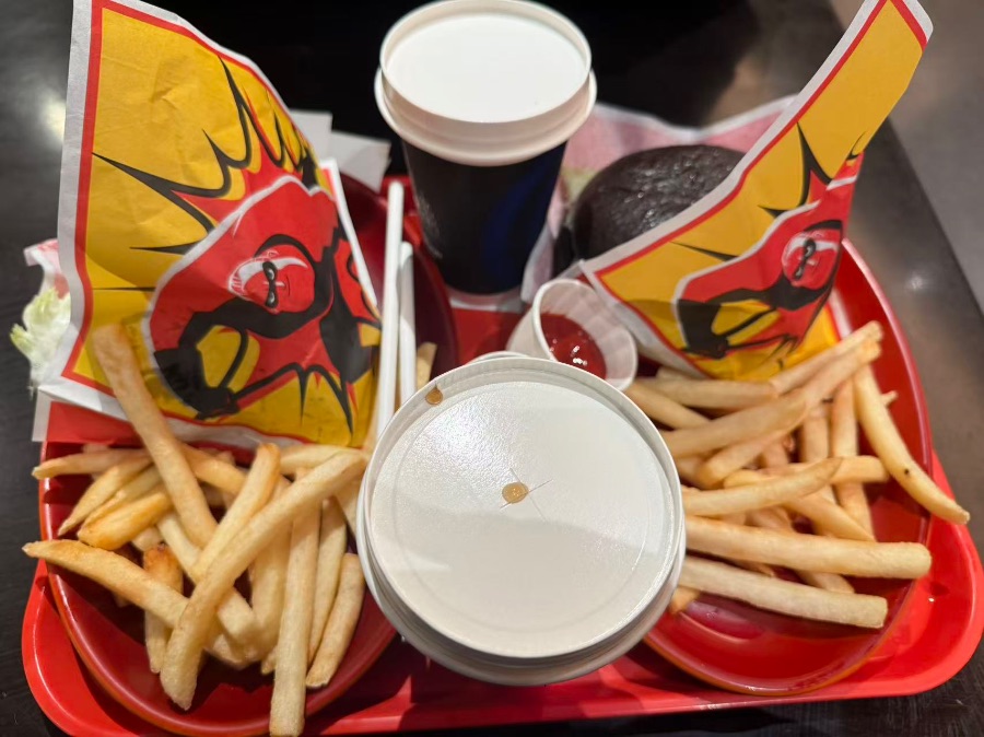 推开店门,暖黄的灯光裹着薯条的香气扑过来,我和朋友挤在靠窗的位置,把红色托盘往中间一推——黑面包的汉堡还带着余温,薯条炸得金黄酥脆,两杯可乐的杯壁凝着细密的水珠。