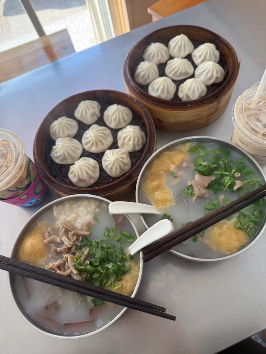 两笼小巧玲珑的小笼包置于竹制蒸笼中,面皮莹白饱满,褶纹细腻规整,捏合处紧致收口,透着鲜美的肉香与汤汁的温润。两碗汤色奶白醇厚的汤品摆在下方,汤底经慢火熬制,鲜醇不腻,碗中搭配嫩滑鸭血、脆爽鸭肠、吸满汤汁的油豆腐,还有弹韧的粉丝,翠绿的香菜与少许葱花点缀其间,鲜香浓郁。一旁摆放着配套的黑檀木筷子与白瓷汤勺,还有两杯冰爽饮品相伴,整体搭配和谐,食物色泽诱人,尽显中式早点的精致与醇厚,传递出温暖又满足的烟火气,是一场兼具美味与幸福感的饮食体验。