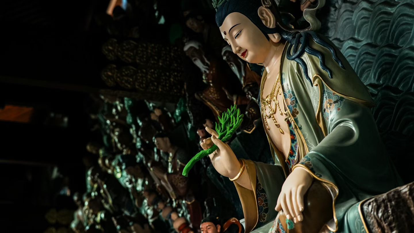 白衣观音像立于画壁之前,素白的衣袂线条流畅柔和,发髻的雕琢细腻规整,指尖轻捻的印诀透着安然禅意。身后的壁画斑斓鲜活,仙官、神将的形象栩栩如生,云纹、祥云的笔触灵动飘逸,绘出一方灵动的神话天地。蓝白相间的壁沿勾勒出雅致边框,与白瓷观音的素净相得益彰,阳光斜斜洒下,在石质台基与观音衣袂上投下斑驳光影。白瓷的素雅与壁画的鲜活相融,禅意与童趣交织,既有着信仰的庄重,又藏着人间烟火的温情。
