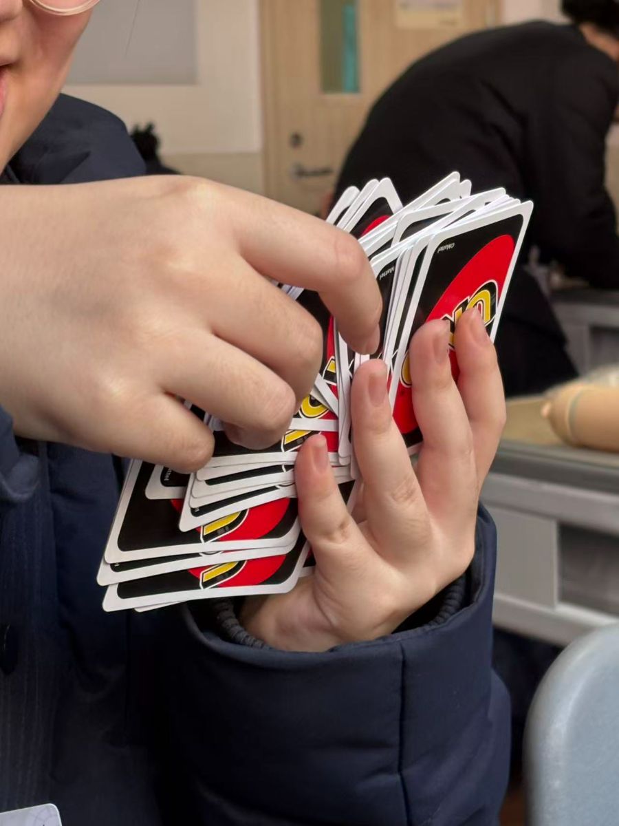 最开心的就是跟同学们把桌子拼起来,围成一圈一起玩,几乎成了每天的固定活动。你坑我我坑你,嘴上相互嫌弃,但每次都玩得很开心,看到一个人手上有一叠牌时我们也会哄堂大笑