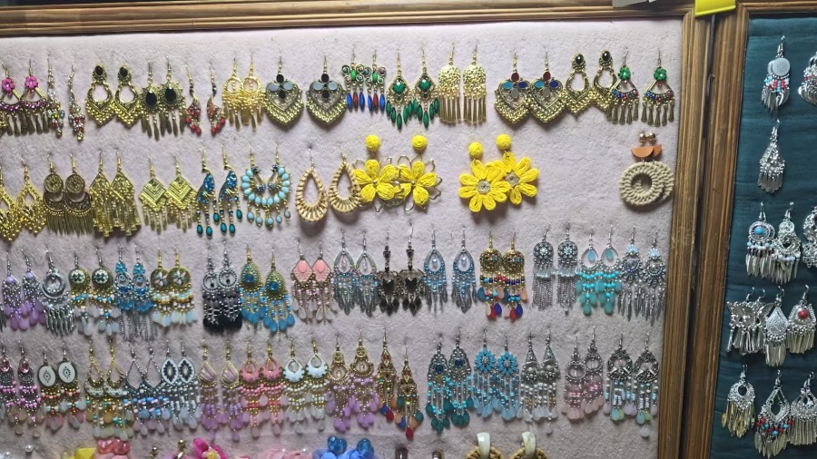 整面墙的陈列错落有致,丰富的色彩在灯光下闪耀着光泽,既适合搭配民族风服饰,也能为日常穿搭增添一抹亮眼的个性。这样充满故事感与氛围感的配饰,不仅是装饰,更是一种态度的表达,能瞬间点亮整体造型,让人在人群中脱颖而出,尽显独特魅力与个性风采。
