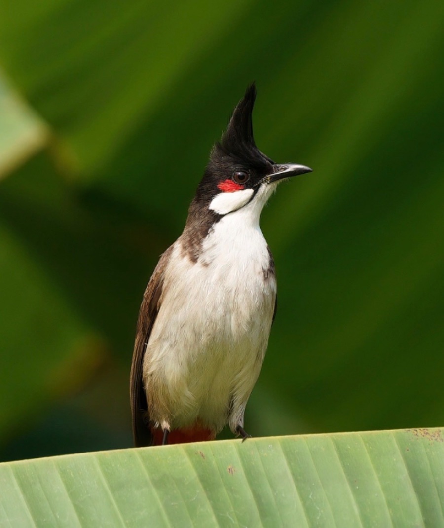 红耳鹎是一种常见的小型鸣禽,体长约 18 至 20 厘米,外形十分醒目。它头顶有标志性的黑色羽冠,眼后有一块鲜红色斑点,如同戴了 “红耳坠”,因此得名。下体白色,尾下覆羽呈鲜艳的红色,整体配色活泼灵动。