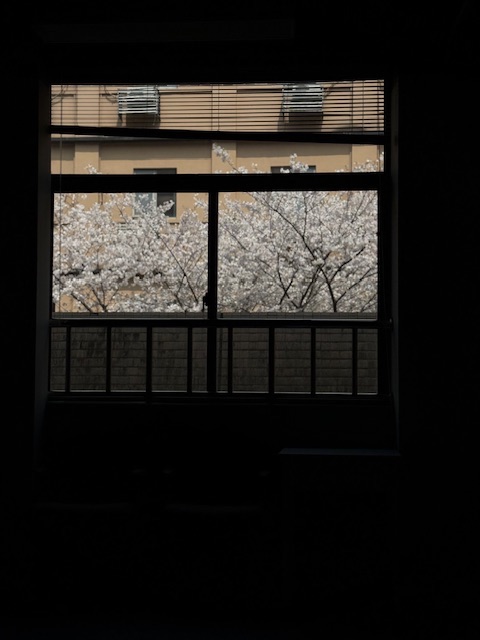 室内是沉郁的墨色,像被时光按下了暂停键,唯有窗外,是鲜活明亮的人间。两株樱花树在春日里肆意盛放,满树繁花如云似雪,层层叠叠的花瓣缀满枝头,在阳光下泛着温柔的柔光,仿佛把一整个春天的浪漫都揉进了这一树洁白里。浅米色的楼宇静静伫立在花树之后,空调外机的冷硬线条,也被这满树温柔晕染出了几分烟火气。