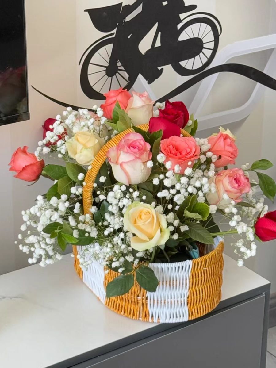 细碎的满天星如白雪点缀其间,蓬松轻盈,中和了玫瑰的浓艳,添了几分灵动与清新,翠绿的叶片穿插其间,更衬得花色鲜亮。整束花被妥帖安置在篮中,置于干净的台面上,背景的简约装饰更衬出花束的鲜活,满是治愈的氛围感,将浪漫与温柔尽数藏进这一篮芬芳里。