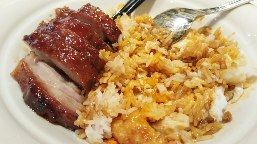 金黄的蛋香炒饭粒粒分明,蛋液的绵密裹着米粒的弹韧,咸香的酱汁浸透每一粒米,蛋香、米香与叉烧的甜香在碗中交融。挖起一勺,软嫩的蛋、弹牙的米、多汁的叉烧一同入口,甜咸碰撞,层次丰富,一口入魂。
