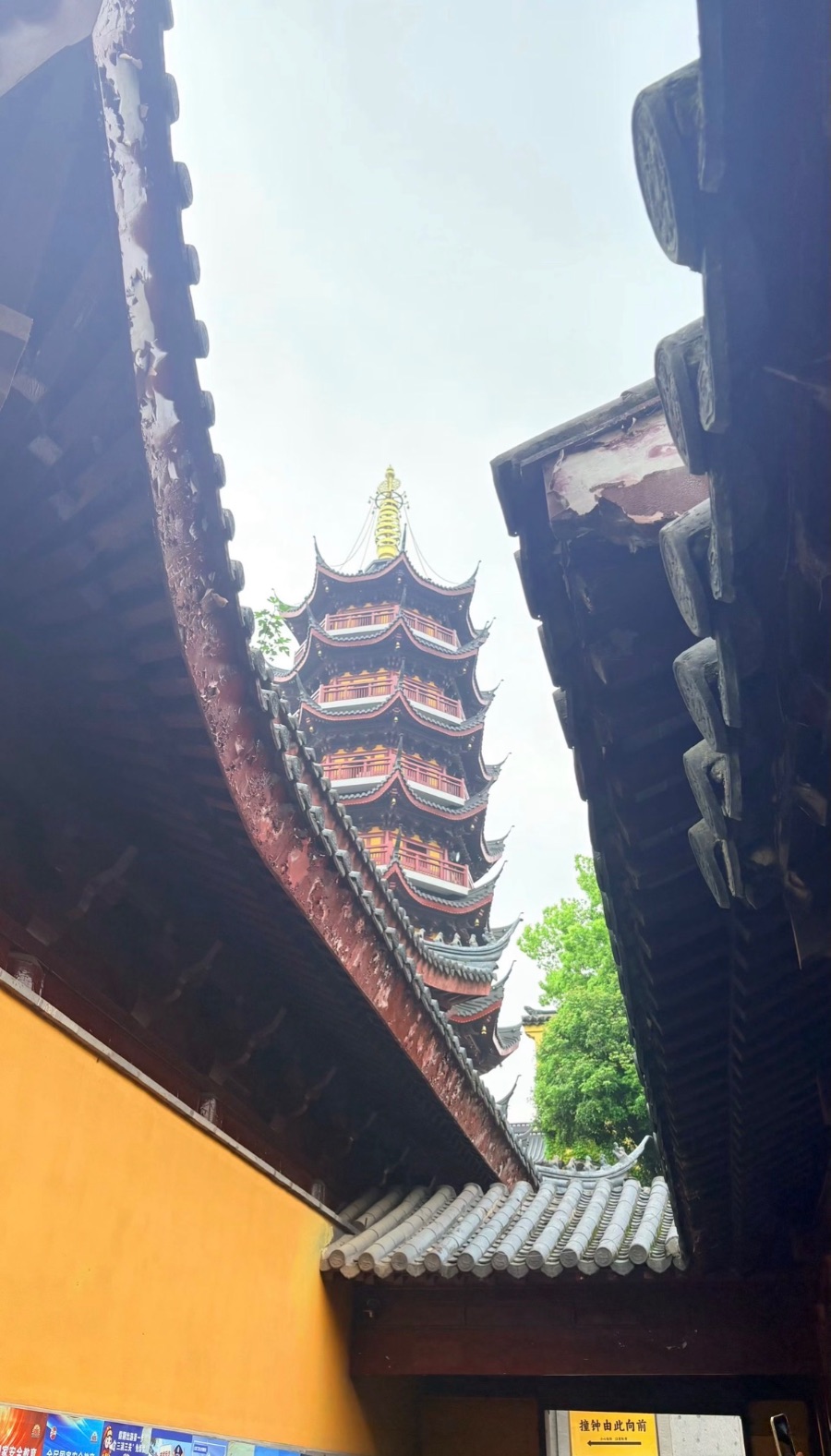两侧飞檐如框,将视线引向深处,鸡鸣寺药师佛塔便在这一方“画框”中静静伫立。七级重檐层层叠叠,朱红与黑瓦勾勒出飞翘的轮廓,顶端金刹在淡雾里泛着微光,像一枚被时光擦亮的印章。下方明黄寺墙、灰瓦屋檐,衬着塔的古朴庄重,远处绿树的鲜绿又添了几分生气。这一帧里,飞檐的阴影、塔檐的风铃,虽未听见,却似有风过的余韵、黄墙的暖调,共同织就了金陵古寺的禅意。游人往来的喧嚣被框在檐外,唯有塔影凝在天光里,藏着千年古刹的安宁与温柔。