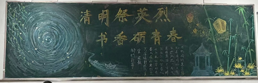 标题采用醒目的金色字体,搭配黑板底色,视觉冲击力强;画面以淡彩粉笔为主,没有使用过于浓烈的色彩,既符合清明的肃穆氛围,又不失青春校园的清新感。