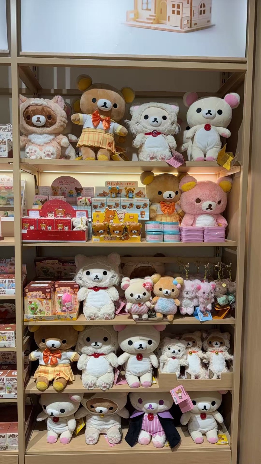 这是一只轻松熊,圆圆的脑袋上竖着两只小巧的耳朵,左耳上还有一朵白色的花。它的眼睛是两颗黑色的纽扣,亮亮的,总是一副笑眯眯的模样,好像在说:“今天也要开心哦!”鼻子是个小小的三角形,微微翘起,显得特别憨厚。