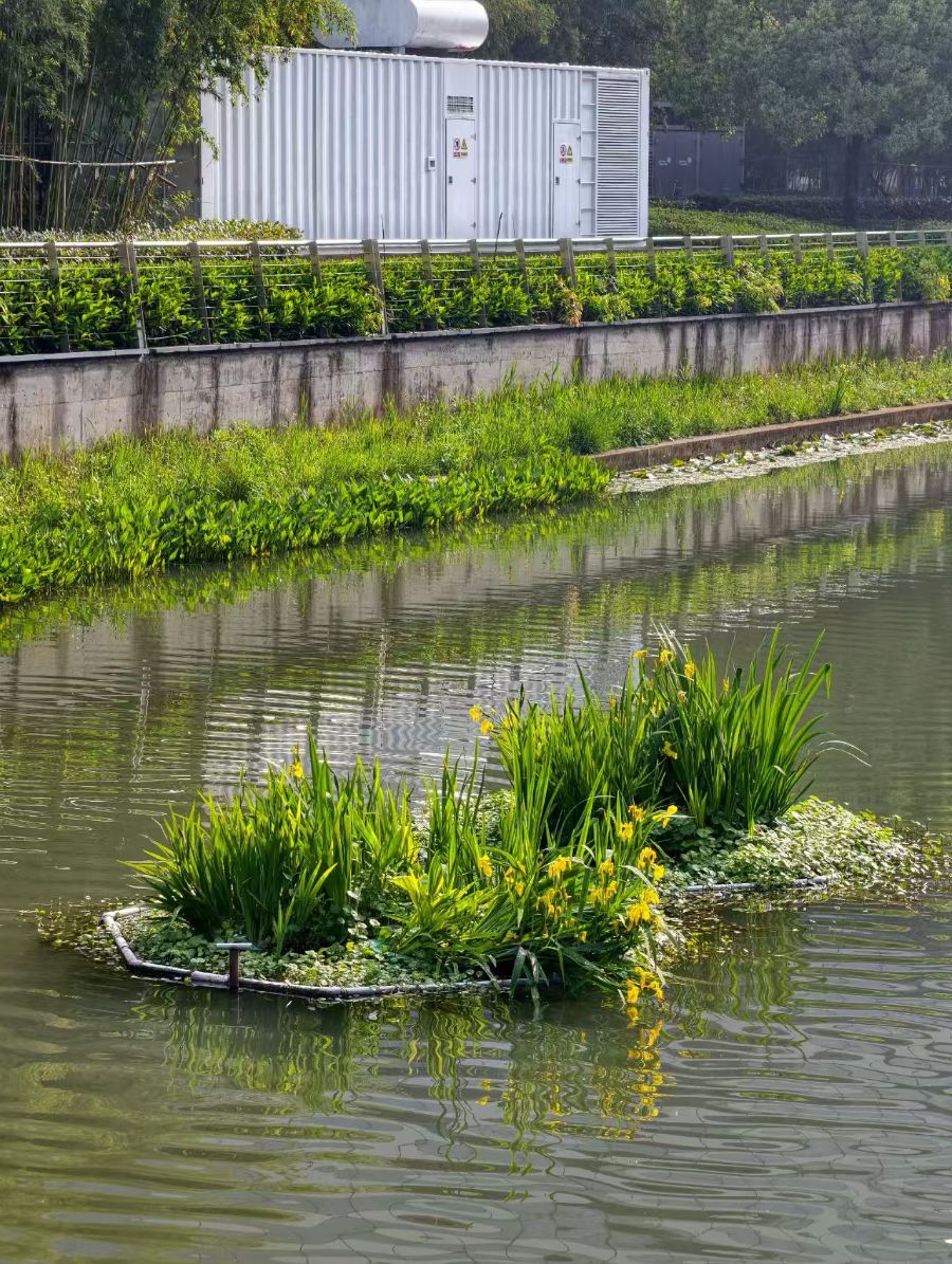 晴日里的河畔,藏着城市里独一份的静谧生机。澄澈的水面如同一面软镜,将岸边的绿树、建筑与蓝天都揉进了温柔的波纹里。生态浮岛浮在水面中央,青翠的鸢尾草舒展着修长的叶片,明黄的花朵在绿意中探出头,浮萍在浮岛边缘铺成细碎的绿毯,随着水波轻轻摇曳。岸边的草木郁郁葱葱,深浅不一的绿顺着河堤蔓延,白色的集装箱式建筑藏在树影间,为这片绿意添了几分现代的秩序感。风拂过水面,漾开层层涟漪,也吹得岸边的枝叶轻晃,带着草木的清新气息漫开来,连空气里都满是慢下来的松弛与鲜活。阳光透过树叶的缝隙洒在水面上,映出斑驳的光影,岸边的石堤爬着浅浅的青苔,远处的竹林在风里沙沙作响,鸢尾花的香气混着水汽漫开,每一处细节都在诉说着城市生态里的宁静与美好。这里没有车水马龙的喧嚣,只有水流、风声与草木生长的轻响,像一片藏在都市里的绿洲,安放着所有关于自然与松弛的向往。